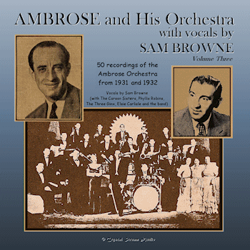 | AMBROSE and His Orchestra with vocals by SAM BROWNE (with a few others) Volume Three 50 recordings from 1931 and 1932 | ©Crystal Stream Audio 2020 IDCD423 Total playing time: 77.57 IDCD424 Total playing time: 77.14 Double CD |