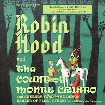 Robin Hood - narrated by and starring Basil Rathbone, with supporting cast. Directed by Les Mitchell; The Count of Monte Cristo - narrated by and starring Herbert Marshall, with supporting cast, including Pedro De Cordoba. Adapted and directed by George Wells; Sweeney Todd, the Demon Barber of Fleet Street - Tod Slaughter and Company. Act 1: A Lovely Throat for a Razor, Act 2: Captain Ingestre's Jewels, Act 3: Treachery - A Foretaste of Hell. Act 4: The Vengeance of Fate. |