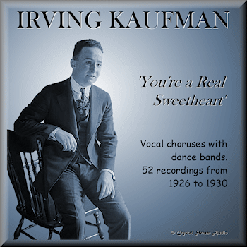 | IRVING KAUFMAN 'You're a Real Sweetheart' 52 vocal choruses with dance bands from 1926 to 1930 | ©Crystal Stream Audio 2018 IDCD375 Total playing time: 77.28 IDCD376 Total playing time: 79.20 Double CD NOTE: All the tracks on this double CD appear on other Crystal Stream Audio CDs featuring the dance bands listed below. |