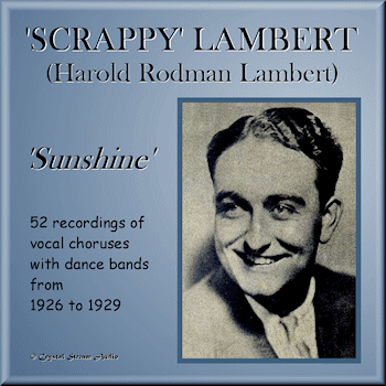 | HAROLD 'SCRAPPY' LAMBERT 'Sunshine' 52 vocal choruses with dance bands from 1926 to 1929 | ©Crystal Stream Audio 2018 IDCD389 Total playing time: 79.35 IDCD390 Total playing time: 78.15 Double CD NOTE: All but the first four tracks on this double CD appear on other Crystal Stream Audio CDs featuring the dance bands listed below. |
