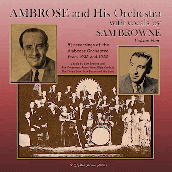 | AMBROSE and His Orchestra with vocals by SAM BROWNE (and a few others) Volume Four 51 recordings from 1932 and 1933 | ©Crystal Stream Audio 2021 IDCD455 Total playing time: 77.36 IDCD456 Total playing time: 77.30 Double CD |
